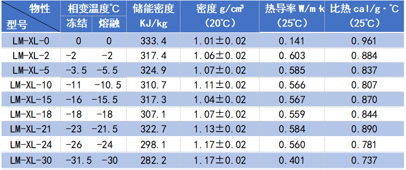 LM-XL系列产品由主储能剂、相变调整剂、防过冷剂、防相分离剂、诱发剂等多组分复合制备而成。本品通过液-固-液相态变化实现冷能的储存和释放,具有较高的储能密度及合适的比热和导热系数。本品不易挥发、安全可靠,可以反复使用。